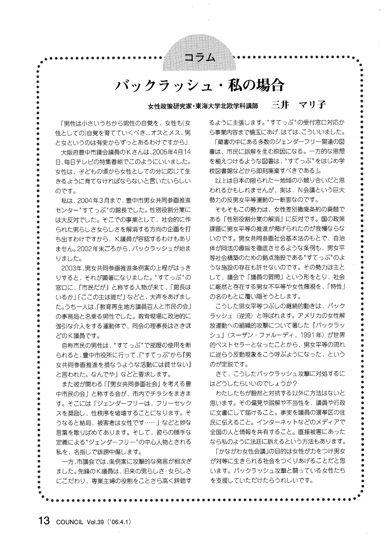 【かながわ女性会議 Council Vol.39 2006年4月1日】