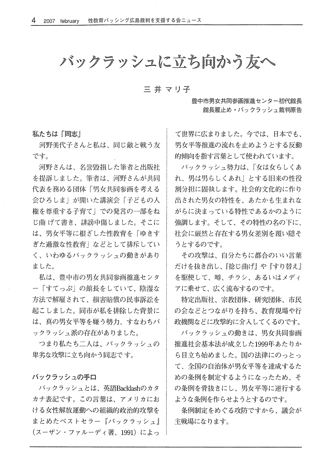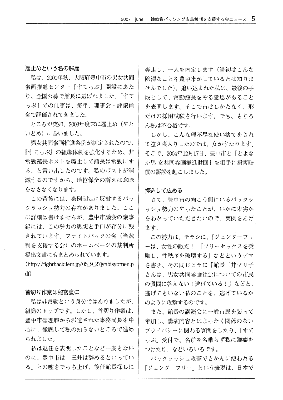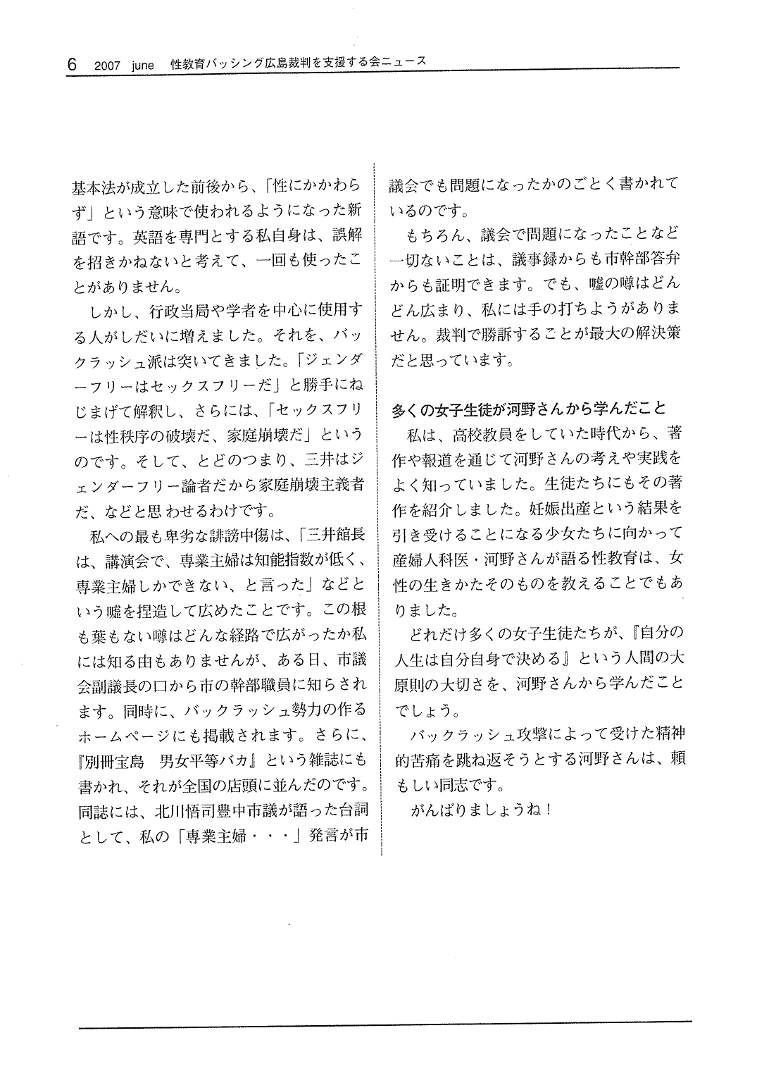 【性教育バッシング広島裁判を支援する会ニュースレター No.10 2007年6月15日】